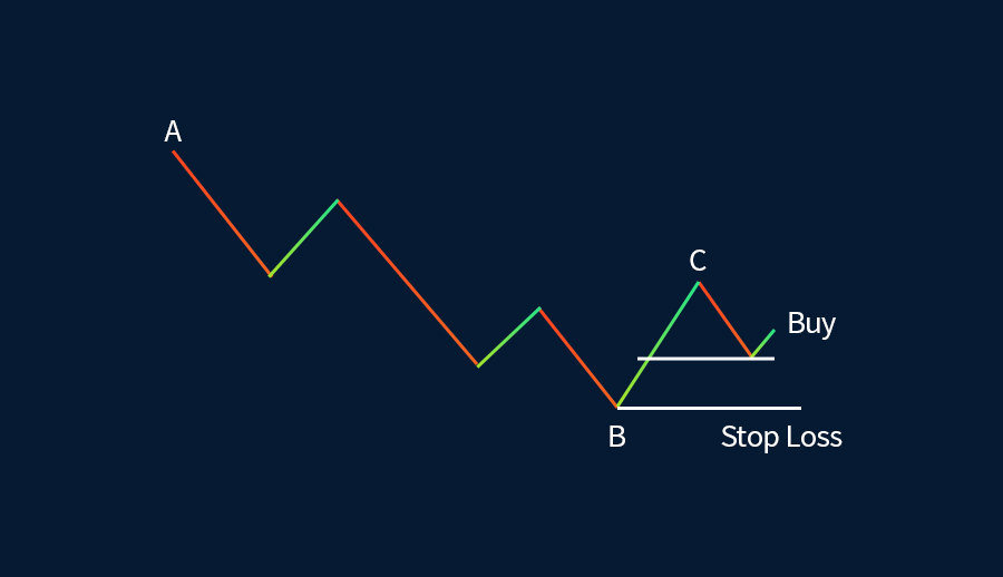 No trading system is complete without risk management rules and, more specifically, a protective stop loss to cater for unexpected price moves after the entry. The stop loss is placed strategically below point B, where any possible price move would invalidate the bullish pattern.