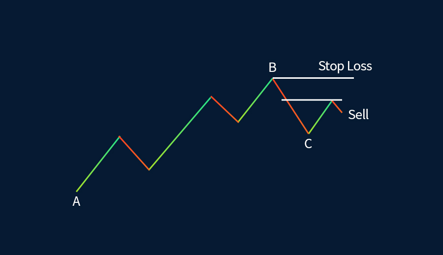 Once more, a protective stop loss is imperative to help protect the trader’s capital. The stop loss is placed strategically above point B, where any possible price move would invalidate the bearish pattern.