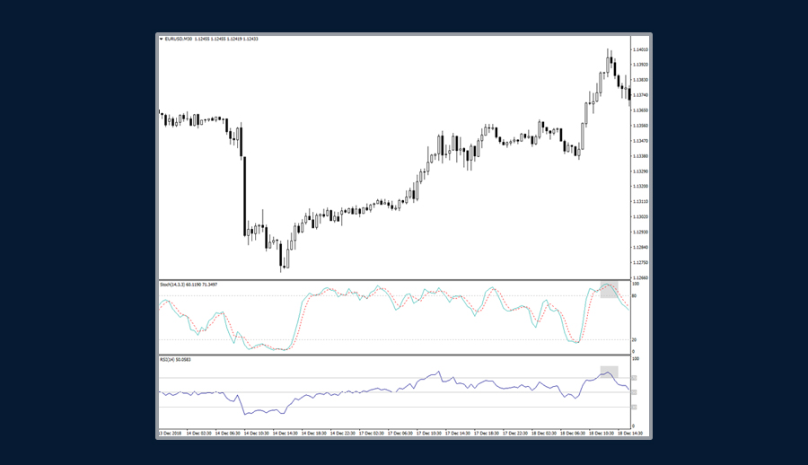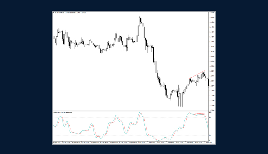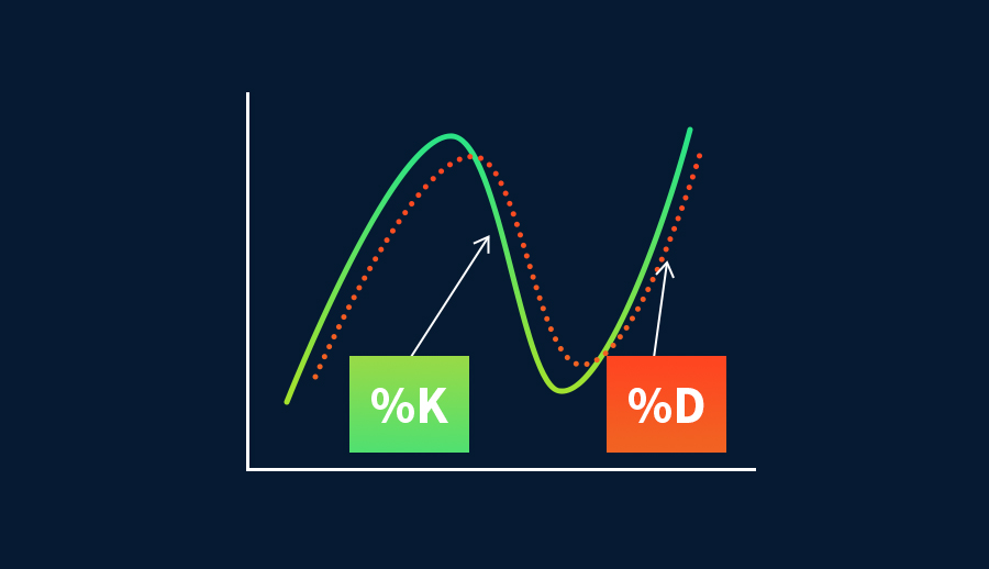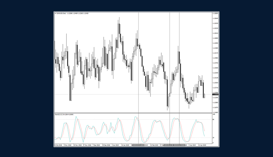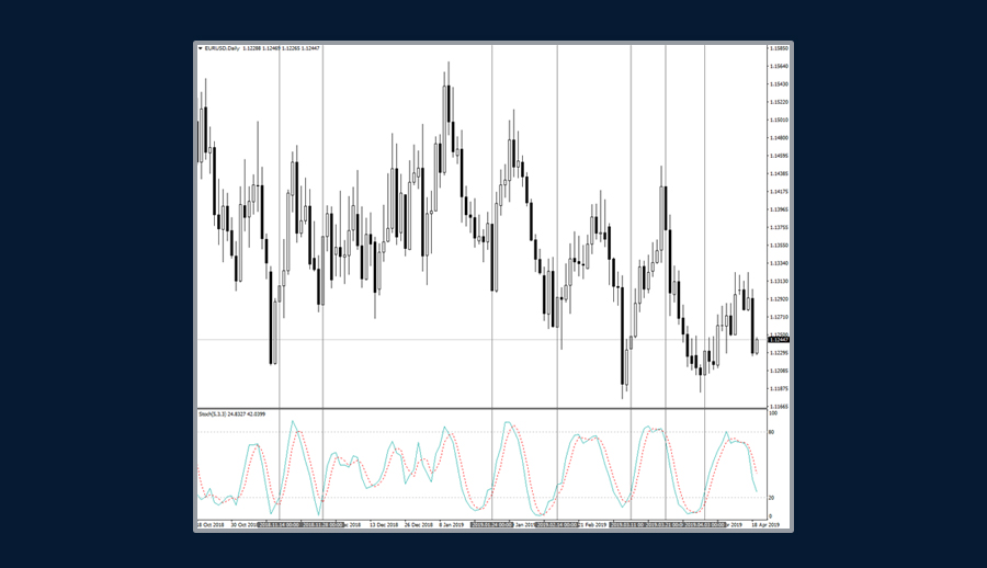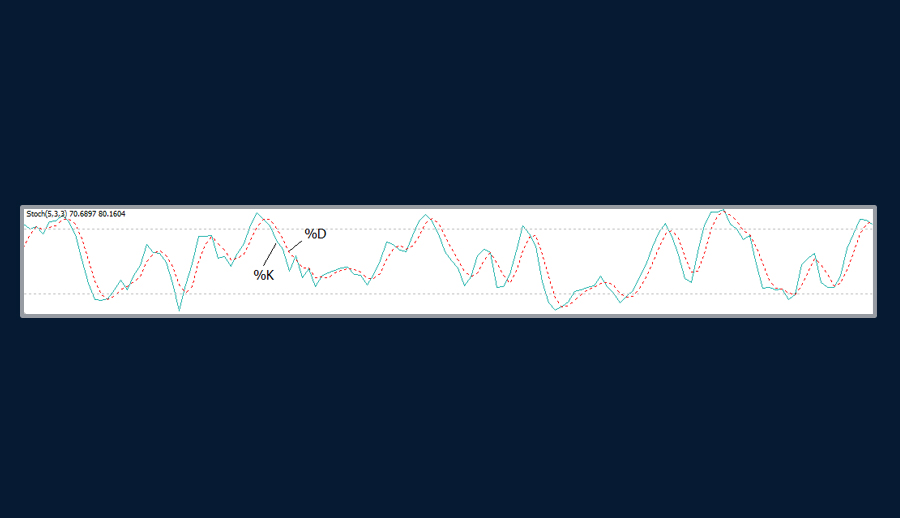 Apart from the oscillation of Stochastics between 0 and 100 and the crossing of the fast line, %K, and the slow line, %D, divergence may also by incorporated for signals.