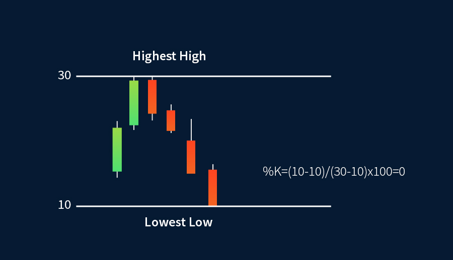 Assuming a period of 5, a highest high of 30, a lowest low of 10 and a current close of 20, the formula above can be used the calculate the %K line: