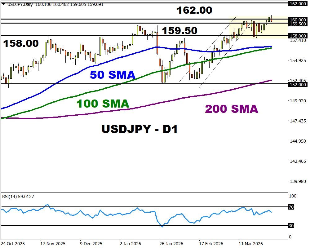 BULLISH: Another solid daily close above 160.00 may encourage an incline toward 161.00 and 162.00.