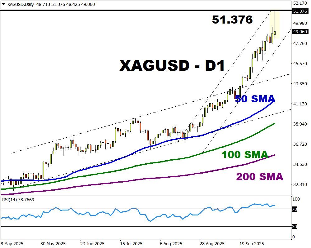 Spot silver surged over 2% past $50 an ounce - its highest since the 1980s Hunt brothers squeeze, as safe-haven demand met tight supply.