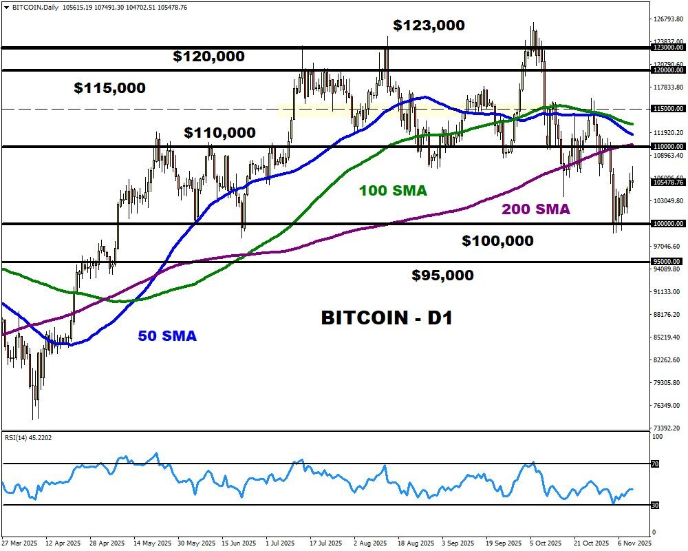 Regarding Bitcoin, it is trading close to $105,000 as hopes of a resolution to the US government shutdown lifted risk sentiment. The key question is whether $100,000 will prove a solid support or a weak floor for bears to conquer.