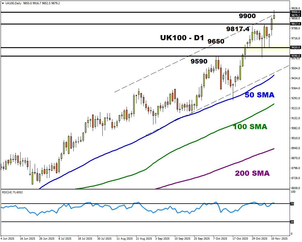 FXTM’s UK100 touched a fresh all-time high on Tuesday, punching above 9900. A solid daily close above this point may open a path toward 10,000.