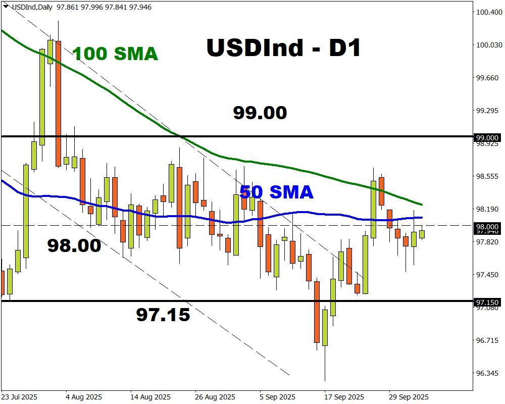 Traders are currently pricing a 98% chance that the Fed cuts rates in October with the odds of another cut by December at 87%. Any major shifts to these bets could rock FXTM’s USDInd.