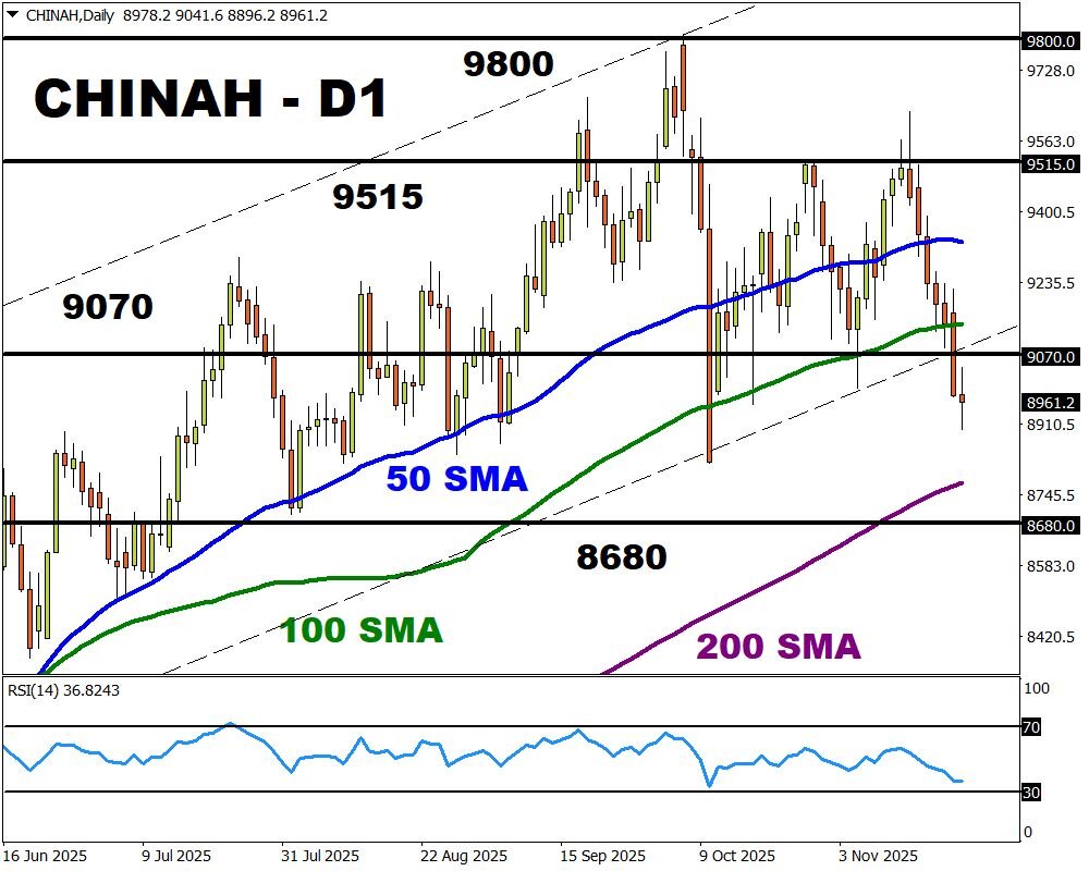 - Strong earnings and optimistic guidance could boost the CHINAH index, pushing prices toward 9070 and the 100-day SMA.