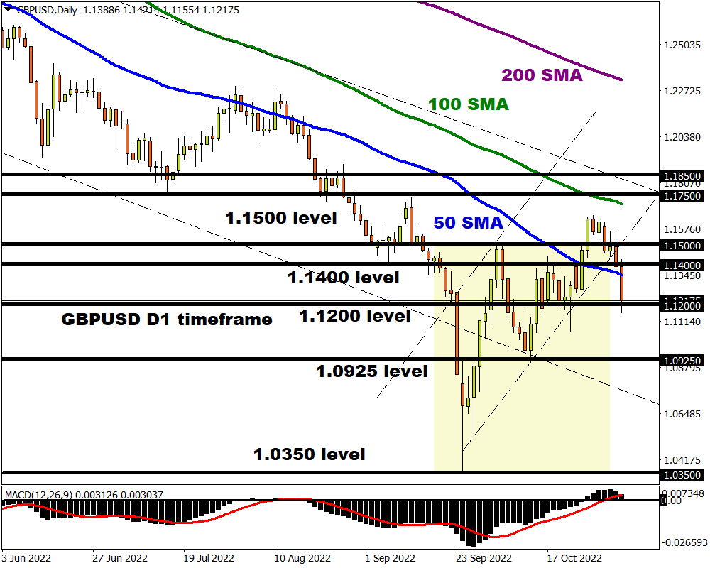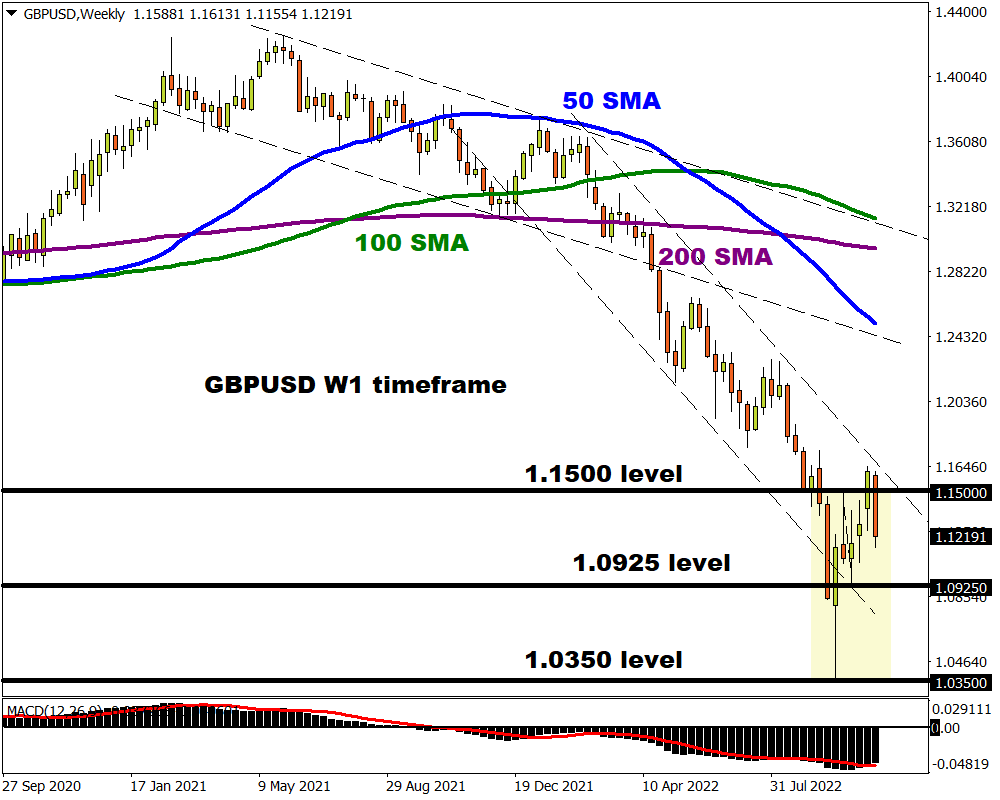 Redirecting our attention back towards the pound, it has weakened against every single G10 currency today. With investors expecting the BoE to exit the jumbo rate hike club by December due to the deteriorating economic outlook and political developments, sterling could be set to weaken further. The GBPUSD remains under pressure on the weekly and daily charts. Sustained weakness below 1.1500 could open the doors back towards 1.0925.