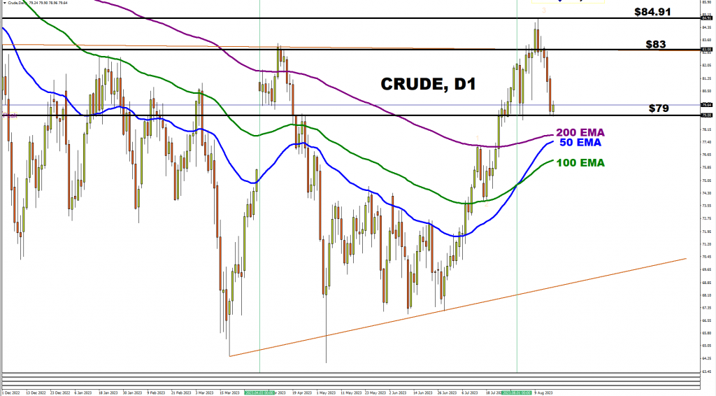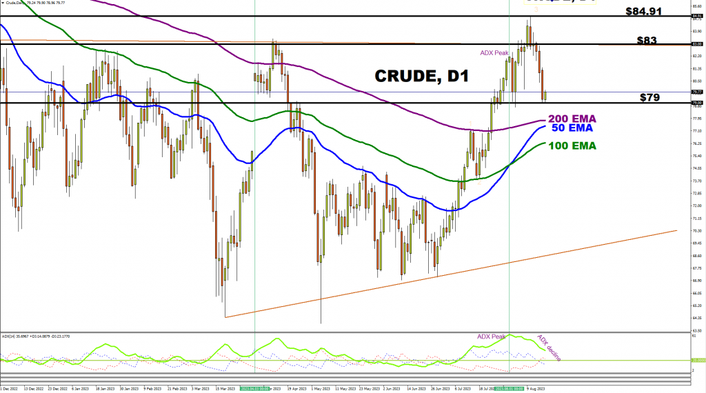 Crude oil prices broke through the $83 resistance level which held for 184 trading days to close at $84.25 on 9th August 2023, and since then have declined back towards the $79 support level at the time of writing.