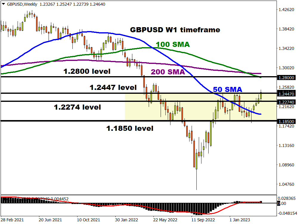 A weekly close above the Janaury peak at 1.2447 is important for buyers to build on this week’s upside bullish momentum. A long-term move towards the 200-week SMA above 1.28 could be on the cards if that happens. Near-term support below the February top is 1.2274.
