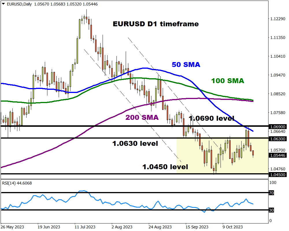 Investors will pay close attention to any fresh clues the ECB has to offer on monetary policy for the rest of 2023 and beyond. Should the ECB communicate that rates will remain higher for longer, this could leave the door open for one final hike in December. As of writing, traders are pricing in only around a 10% probability of an ECB rate hike by December with the odds of a rate cut by April roughly 50%.