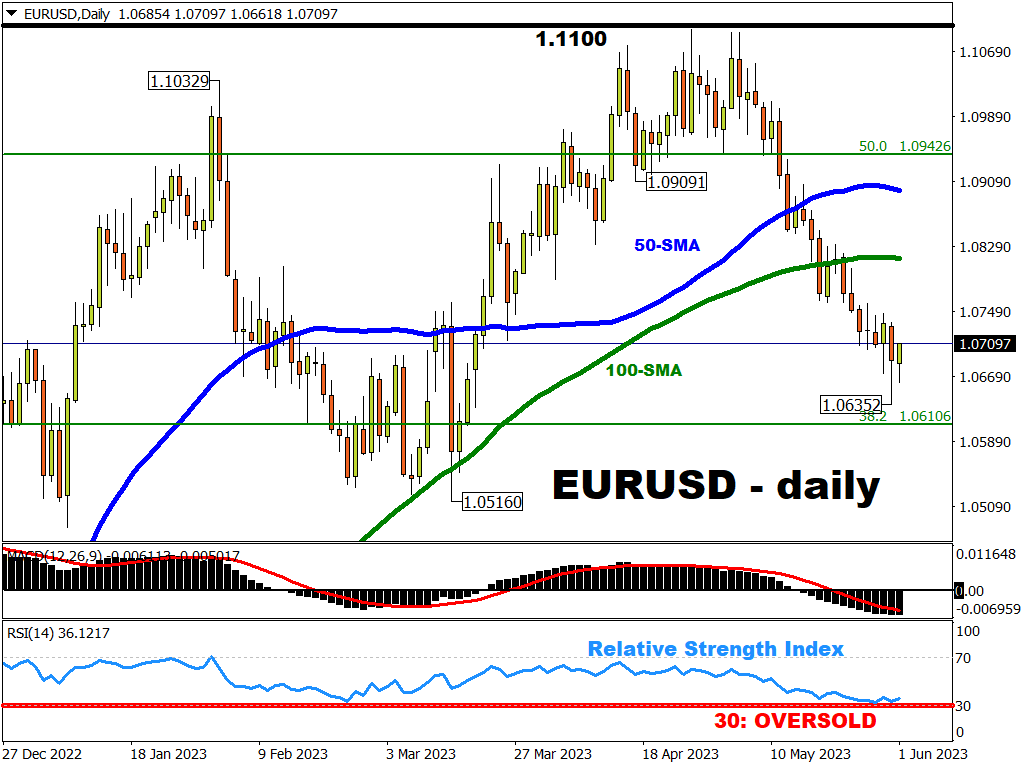 EUR/USD dropped to a ten-week low at 1.06352 yesterday before attempting to pare some of its losses at the time of writing.