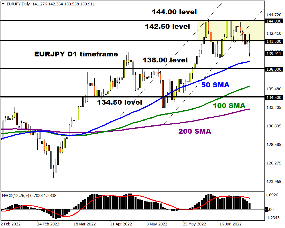 After failing to conquer the 144.00 resistance level, the EURJPY could be experiencing a bearish reversal with the breakdown under 141.50 signalling further downside. A weaker euro could drag the EURJPY towards the 138.00 support level. Should bears secure a strong daily close under this point, the next level can be found around 134.50.