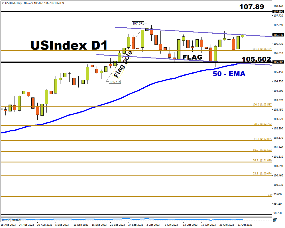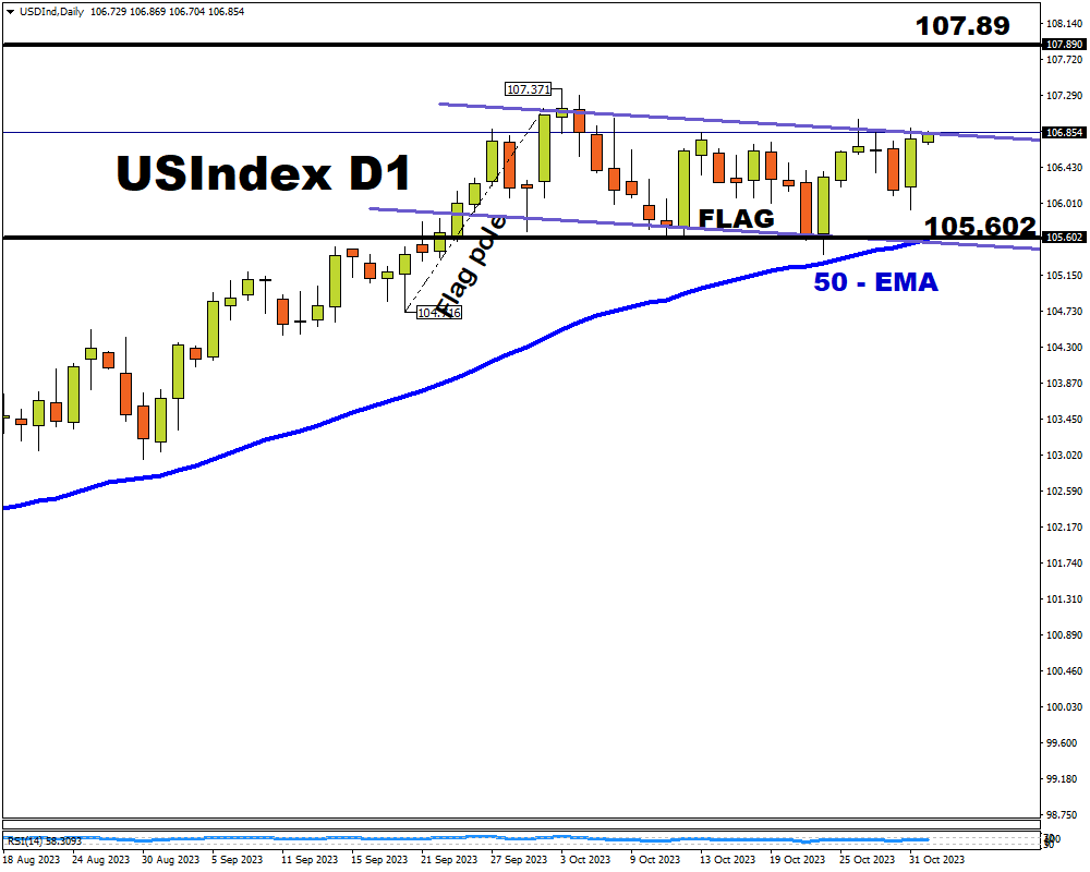 The USDInd may see a volatility-triggering event today (Wednesday, November 1st).