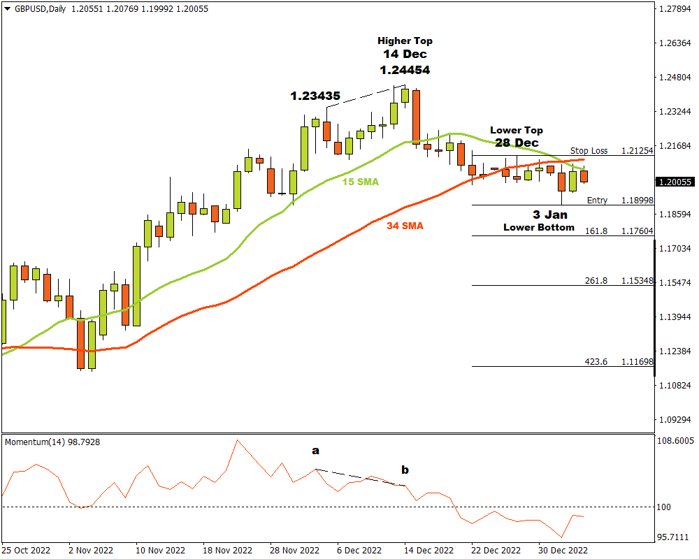 A closer look at the Momentum Oscillator reveals a negative divergence between points “a” and “b” when comparing the tops at 1.23435 and 1.24454. This could have warned technical traders that the bullish trend was losing momentum.