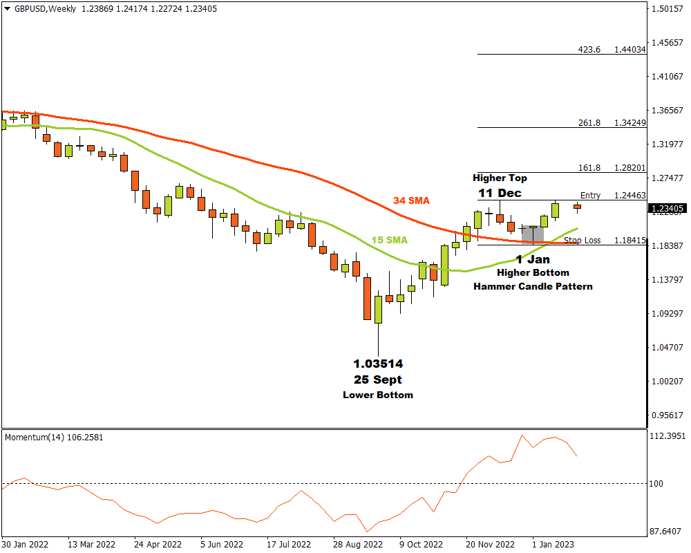 If the price breaks through the resistance level at 1.24463, then three possible price targets can be calculated from there. Attaching the Fibonacci tool to the higher top 1.24463 and dragging it to the bottom of the support level near the 34 Simple Moving Average at 1.18415, the following targets can be determined. The first target may be estimated at 1.28201 (161.8%). The second price target is possible at 1.34249 (261.8%) and the third and final target can be anticipated at 1.44034 (423.6%).