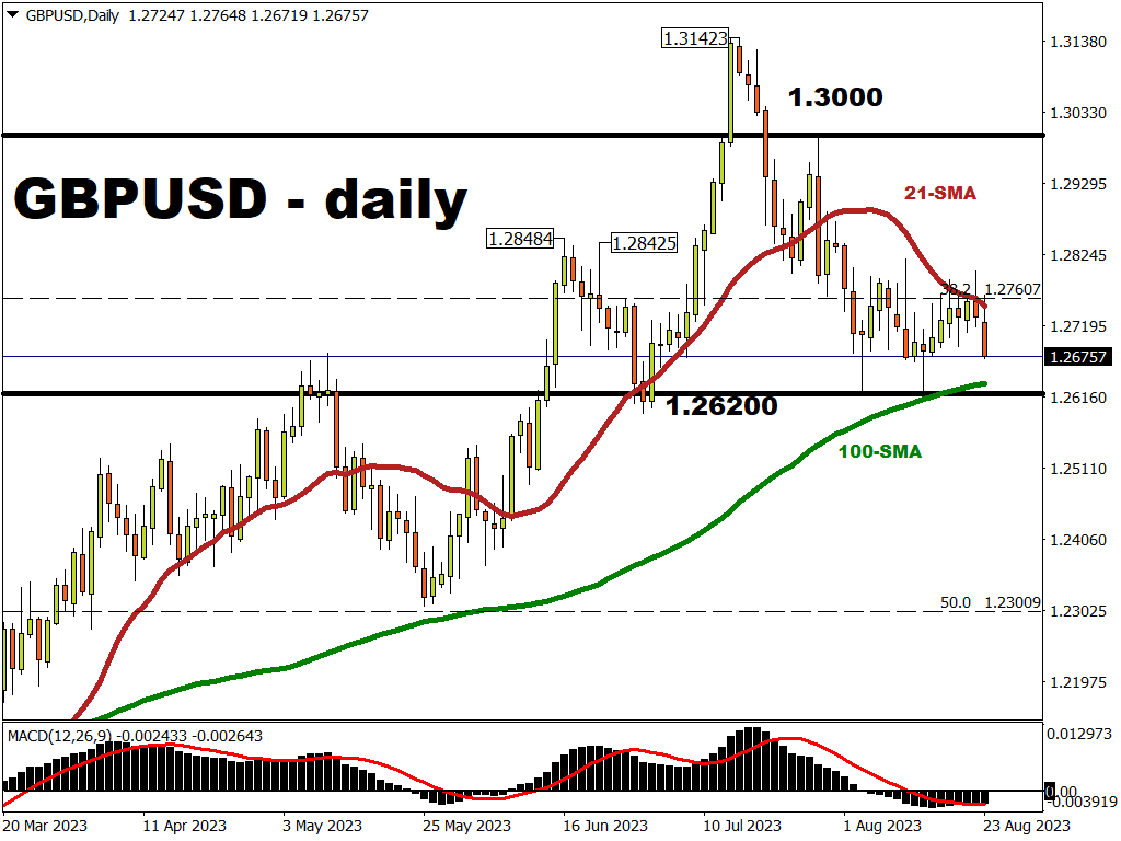 To the downside, the 1.26200 region has been offering support for GBPUSD (nicknamed “cable”) since end-June, with the 100-day SMA also potentially offering further support nearby.