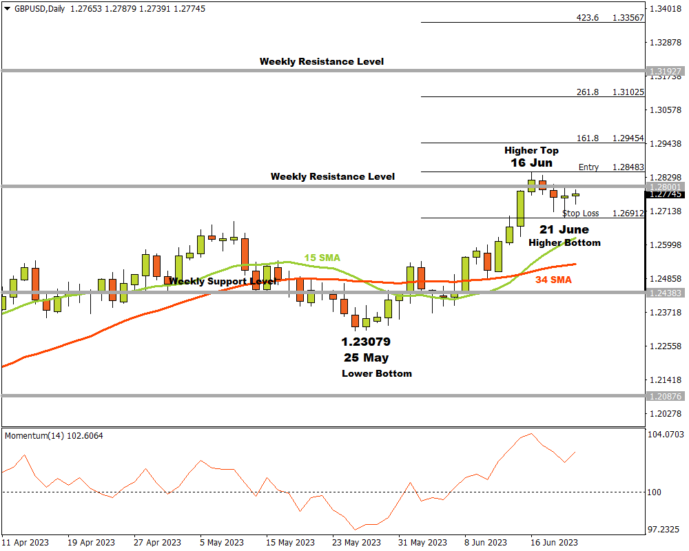 Bulls jumped back into the scene after prices rebounded from the 1.23079 lower bottom on 25 May. Since then, prices have pushed higher, breaking through the weekly resistance level that become a support and was retested by bears. The price reached another weekly resistance level and a higher top was created on 16 June at 1.28483. Although bears tried to pull the price down and succeeded for a short while, bulls seem determined to re-test the weekly resistance level with a higher bottom forming on 21 June at 1.26912.