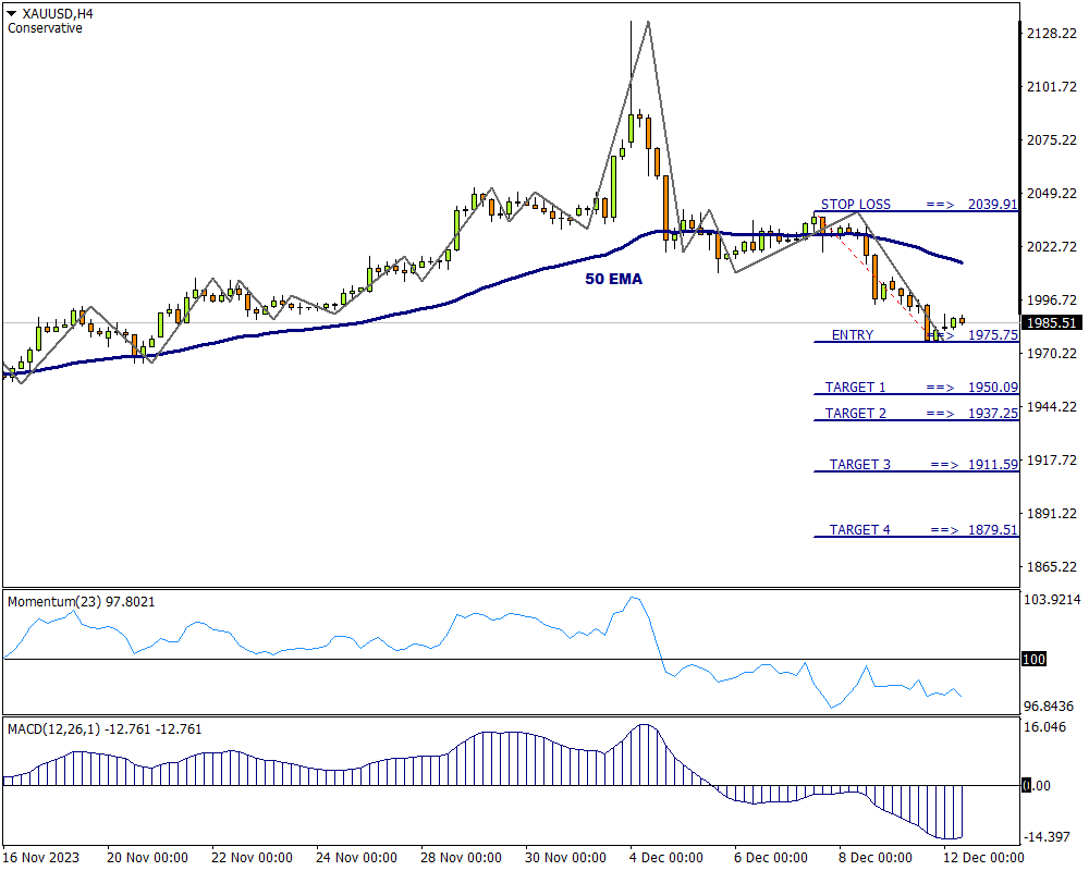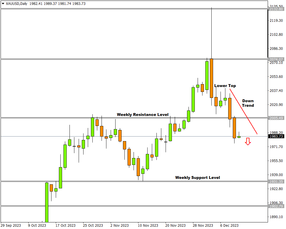 After the spectacular bearish move on Monday 4th December, gold is back in bearish territory.