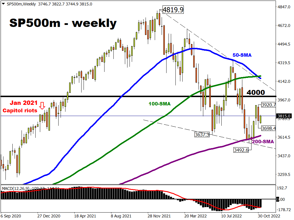 Heightened macro fears (and downward earnings revisions) may yet see the S&P 500 ultimately retesting its 200-week SMA for support in the mid-3000 region.