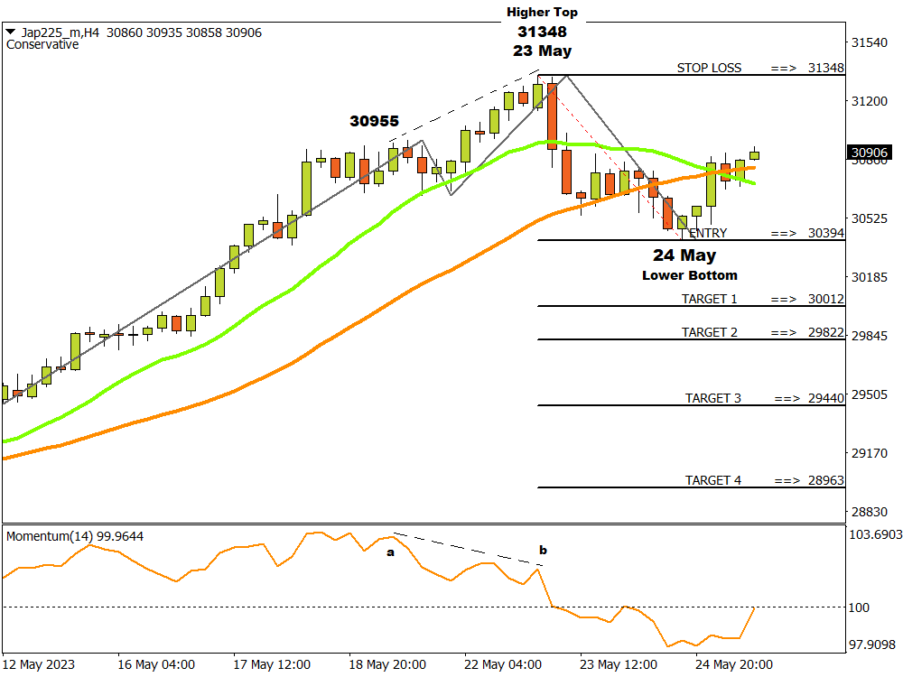 The Jap225 index on the H4 time frame was in bullish territory from the beginning of May. However, bears did try to challenge their reign a few times but to no avail. This changed on 23 May when a last higher top formed at 31348. The bears got enough backing to start a shift in the market momentum.