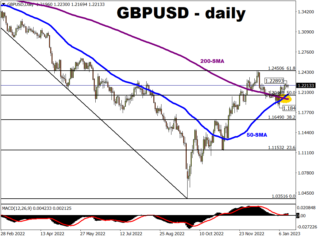 Bulls need to beat yesterday’s high at 1.22893 to take a look at the December top at 1.24506 where sits the 61.8% Fib retracement line from 2022's drop.