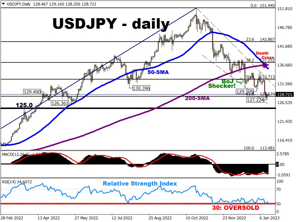 A bearish channel with a series of lower highs and lower lows has now seen prices hit at the 61.8% Fib level of last year’s rally at 128.174.