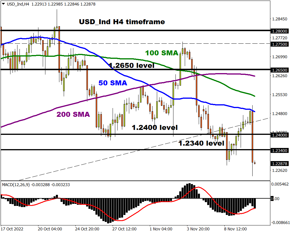 Earlier in the week, we identified how 1.2400 was an important level on the equally-weighed USD index. Prices have cut through this level like a hot knife through butter and even the 1.2340 target. The downside momentum could drag prices towards 1.2200.