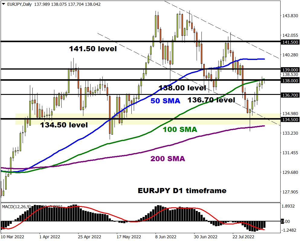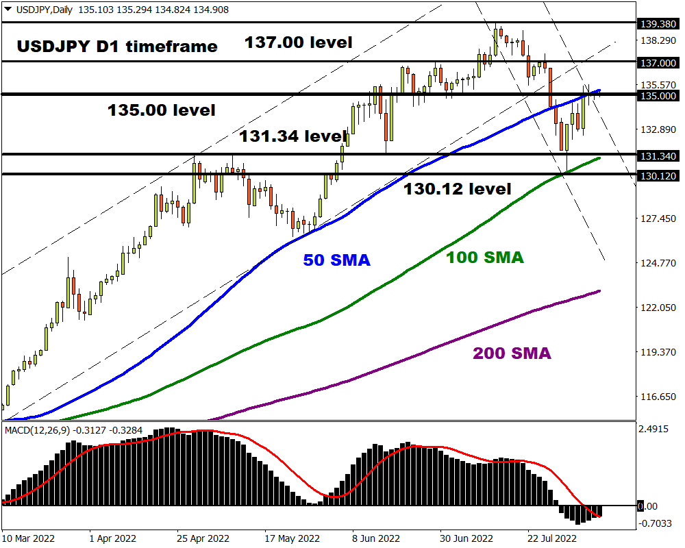 After staging a sharp bounce from the 100-day SMA at the start of August, the USDJPY is trading around 135.0 as of writing. A strong breakout above this level could open a path towards 137.00 and 139.380. Sustained weakness below 135.00 may trigger a selloff towards 131.34.