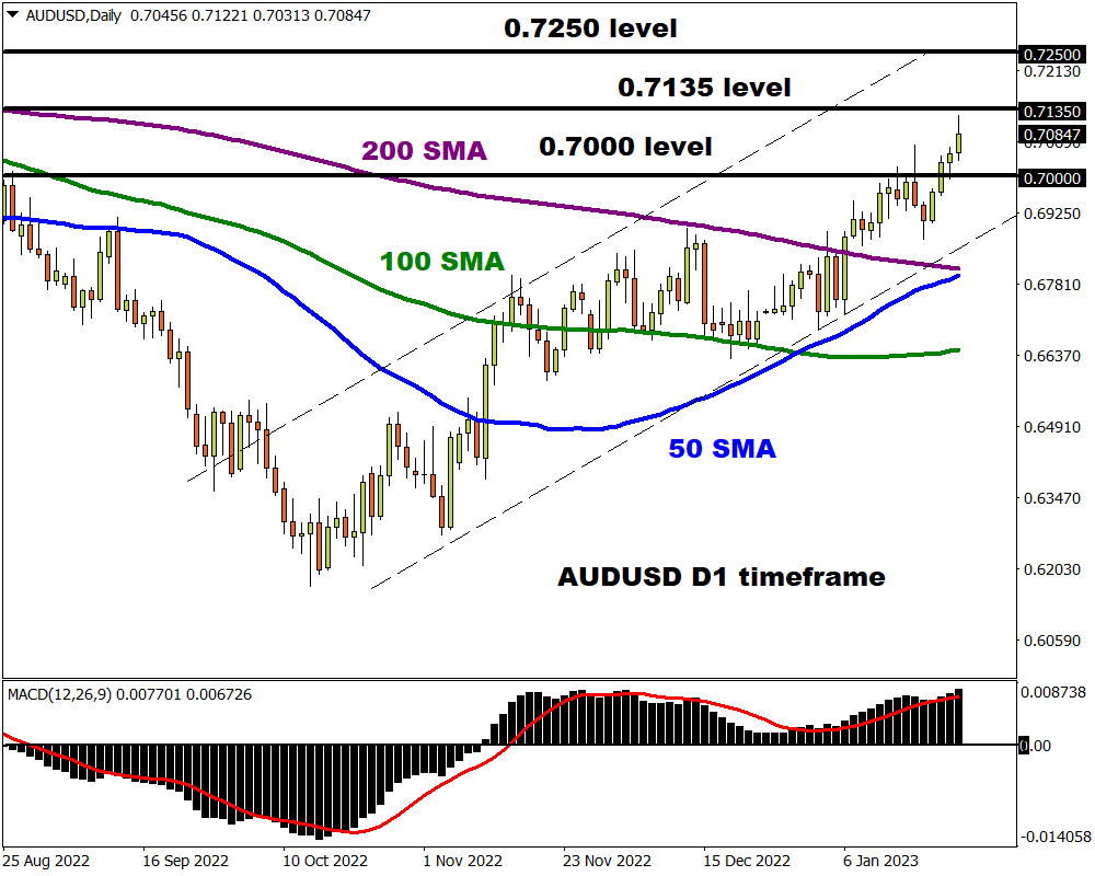 Aussie bulls continue to draw strength from dollar weakness. After breaking above the 0.7000 level, prices have pushed higher, with 0.7135 acting as a key point of interest. A breakout above this level could suggest an incline towards 0.7250. Should prices slip back below 0.7000, the AUDUSD may decline toward 0.6900.
