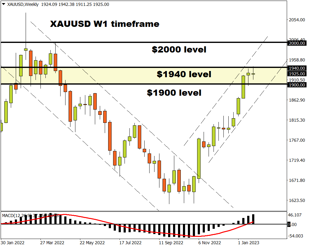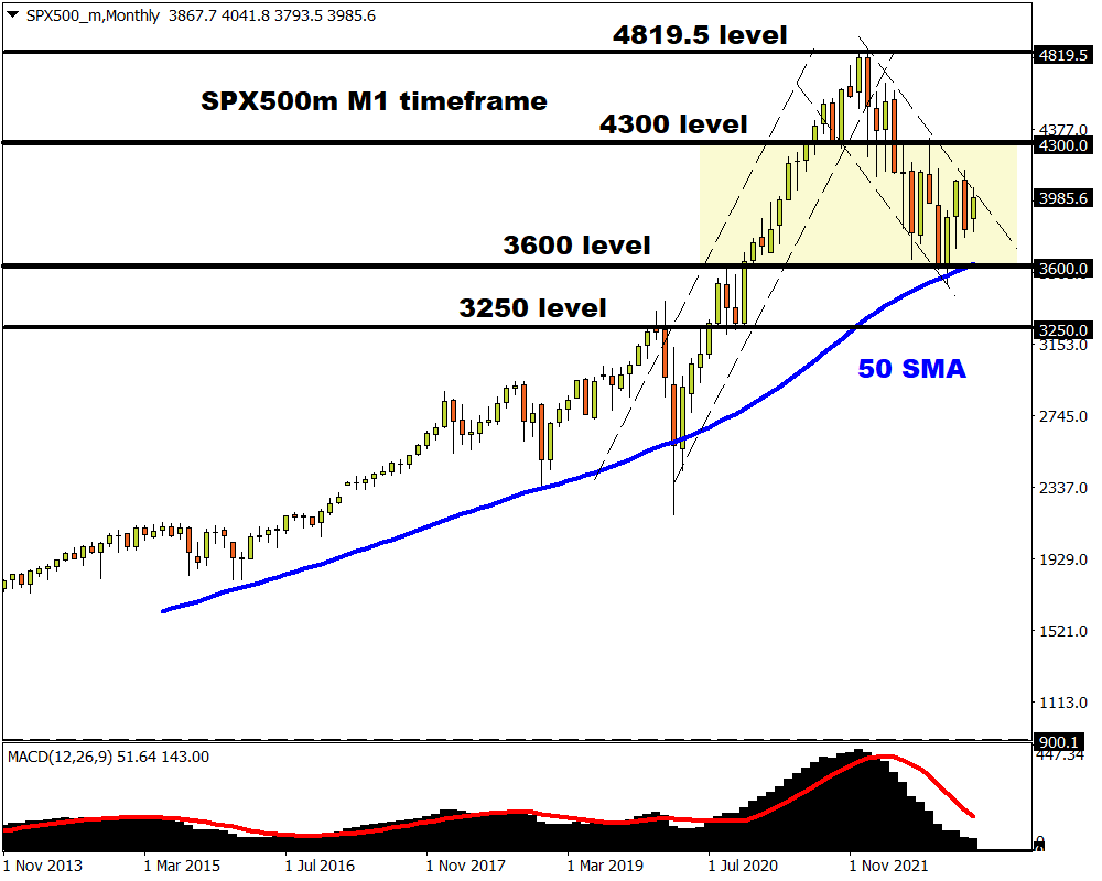 The S&P500 has been trapped within a wide range since May 2022. May support can be found around 3600 and resistance at 4300 on the monthly timeframe. Given the various fundamental forces influencing global sentiment, a breakout could be on the horizon. A strong breakout above 4300 could open a path towards 4819.5. Alternatively, a selloff below 3600 could signal a further decline towards 3250.