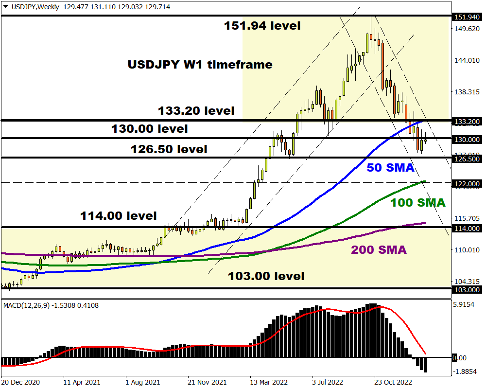 USDJPY remains under pressure on the weekly timeframe as there have been consistently lower lows and lower highs. Prices are trading below 130.00 and could challenge 126.50 in the short to medium term. A strong breakdown below 126.50 may open the doors toward 122.00. If prices are able to push back above 130.00, the next key point can be found at 133.20.