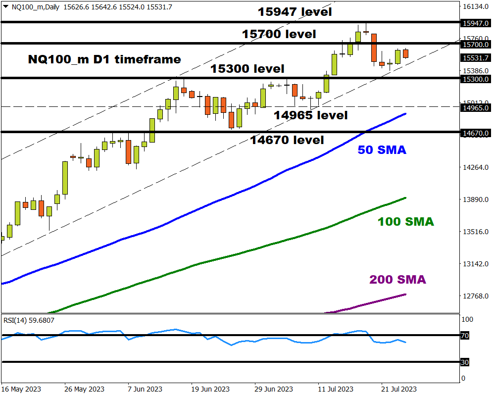 Our trade of the week remains in an uptrend on the daily charts. A strong move above 15700 could inspire a move towards 15947. Should prices slip back under 15300, the selloff may take the index towards 14965.