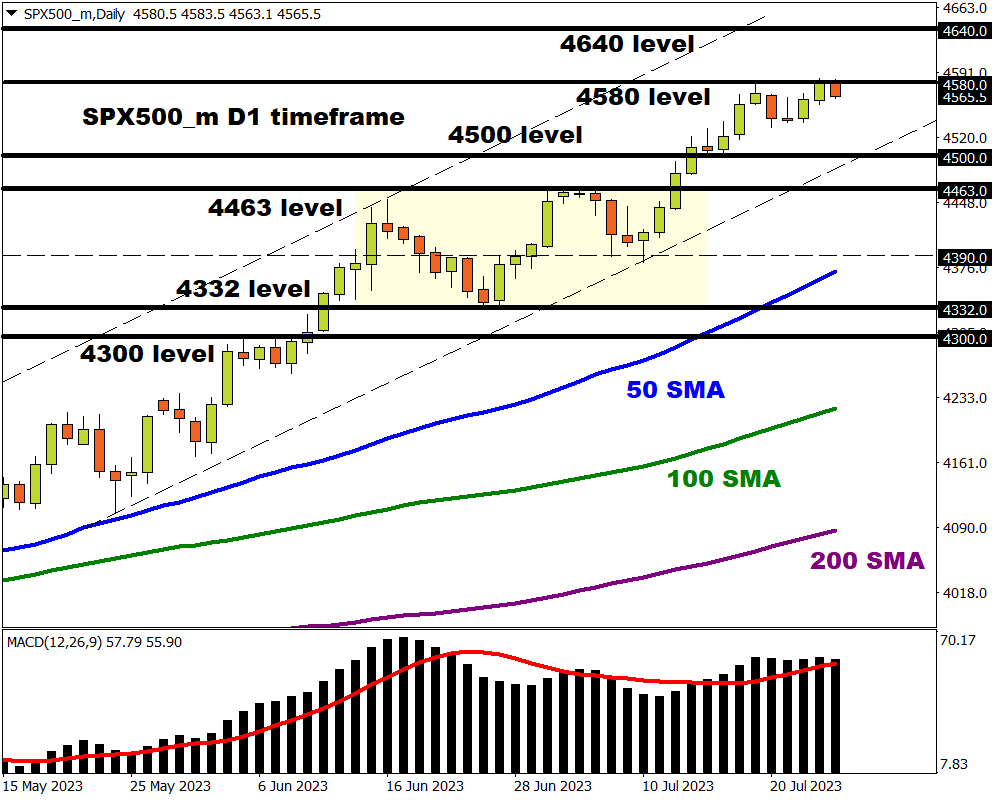 Expect the SPX500_m to be rocked by earnings releases from the largest companies in the world. The index remains bullish on the daily charts with resistance found at 4580. A strong breakout and daily close above this point could trigger a move toward 4640. Sustained weakness below 4580 could see prices test 4500 and 4463.