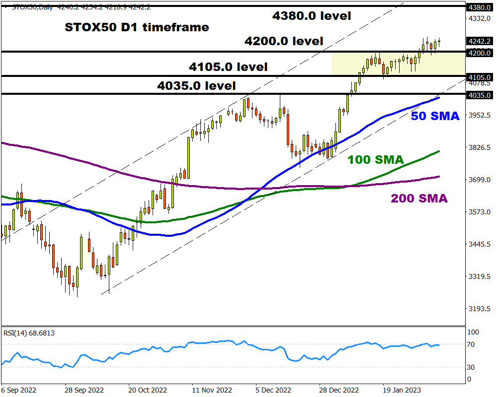 After breaking above 4200, the STOX50 Index could be poised for further upside with 4380 acting as the next key level of interest. Prices remain bullish on the daily charts with the candlesticks trading firmly above the 50, 100, and 200-day SMA. It may be wise to keep a close eye on the RSI which is pointing to overbought levels. Should this lead to a decliner back below 4200, prices may slip back toward the 4105 support.