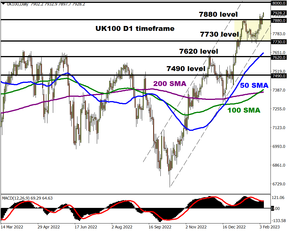 The FTSE100 set fresh record highs this morning after risk appetite was boosted by the rally on Wall Street overnight. Prices are trading above the 50, 100, and 200-day SMA while the MACD trades above zero. The trend remains heavily bullish with the next key level of interest found at 8000. Alternatively, a move below the 7730 support level could signal a selloff towards 7620 and 7490, respectively.