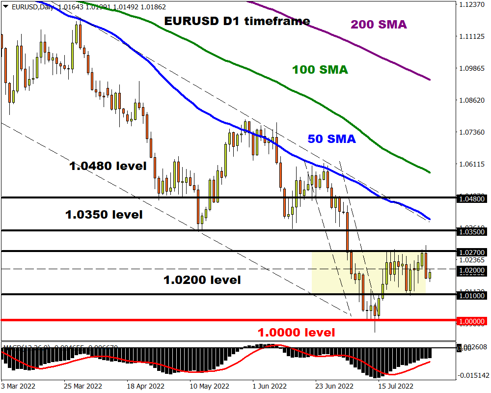 A classic breakout/down opportunity could be forming on the EURUSD with support at 1.0100 and resistance at 1.0270. A solid daily close above 1.0270 may open the doors towards 1.0350 and 1.0480. Alternatively, a selloff below 1.0100 could inspire a move back towards parity.
