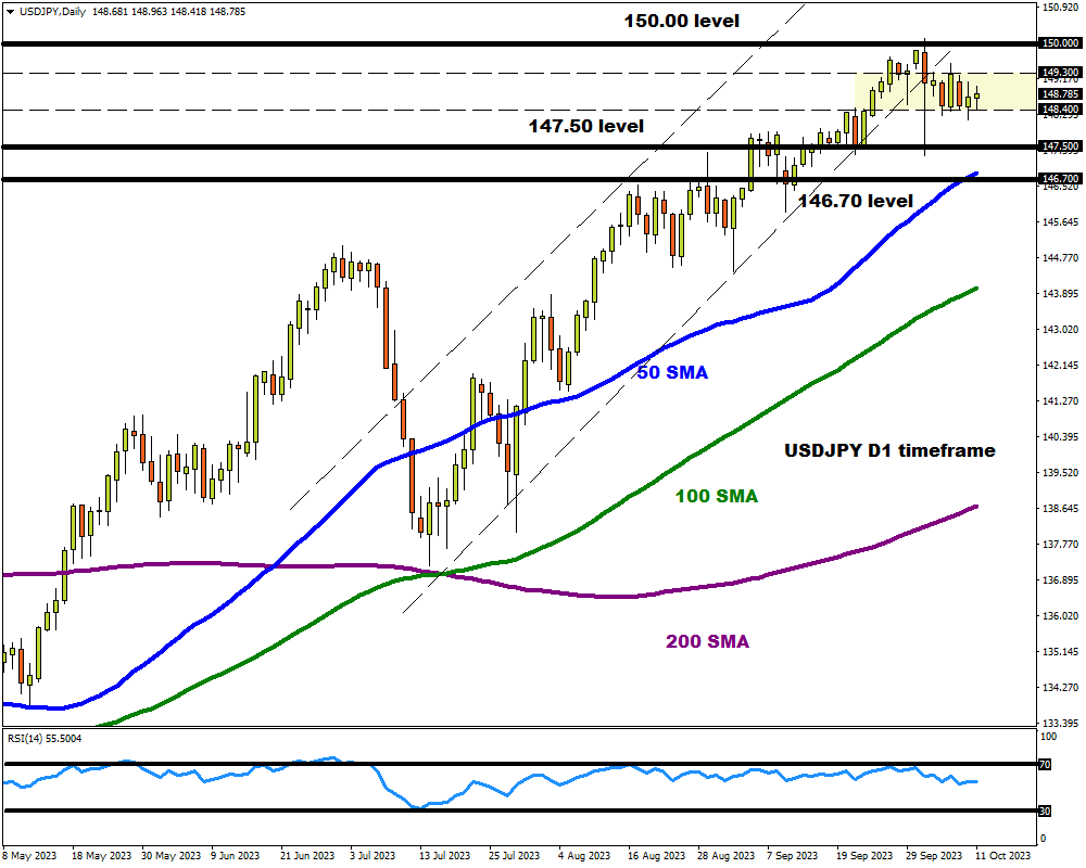 After the aggressive reaction to the 150.00 level earlier this month, the USDJPY remains trapped within a wide range with support at 147.50 and resistance at 150.00. The currency pair remains pulled and tugged by various fundamental forces while the technicals suggest that a breakout could be on the horizon. Should prices slip below 148.40, this may trigger a selloff towards 147.50 and 146.70 – where the 50-day SMA resides. Alternatively, a strong break above 149.30 could see prices re-challenge 150.00.