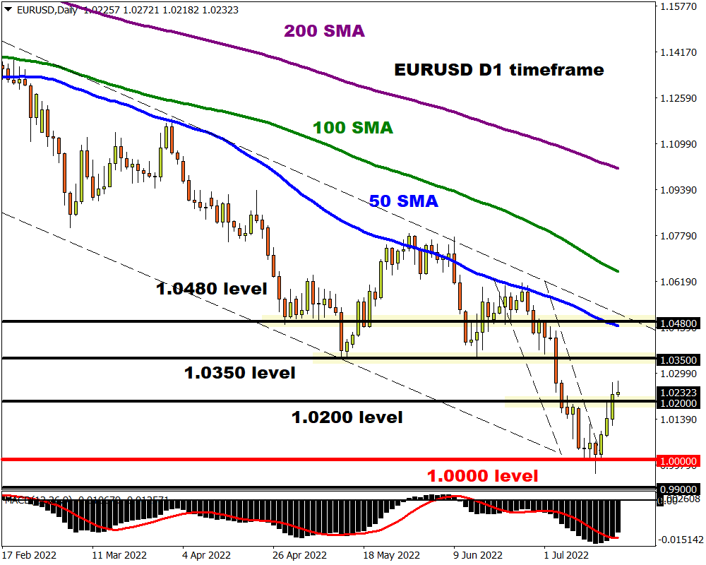The currency pair has jumped over 150 pips since Monday with prices trading around 1.0230 as of writing. Given how a daily close above 1.0200 has been secured, the next key level of interest can be found at 1.0350 and 1.0480. Should 1.0200 prove to be unreliable support, a decline back towards 1.0130 and 1.0000 could be on the table.