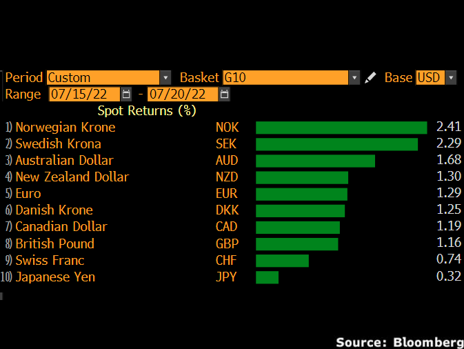 It has weakened against every single G10 currency this week as investors cut bets on how aggressive the Federal Reserve may be when raising interest rates in July. The upbeat market mood has also dulled appetite for the safe-haven currency as market players eye stock markets and riskier currencies.