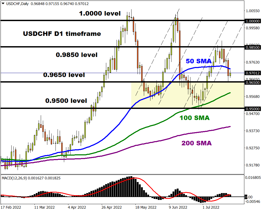 A weaker dollar has dragged the USDCHF below the 50-day Simple Moving Average. Prices remain choppy but bears could gain ground if a daily close below 0.9650 is achieved. Under this level, the next key level of interest can be found at 0.9500. Should 0.9650 prove to be reliable support, the USDCHF could experience a rebound back towards 0.9850.