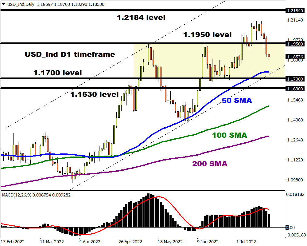 A similar scene can be observed on the equally weighted dollar index with prices approaching the 50-day Simple Moving Average. The trend is turning bearish with the next key support found at 1.1700. A solid breakdown below this level may trigger a decline towards 1.1630.
