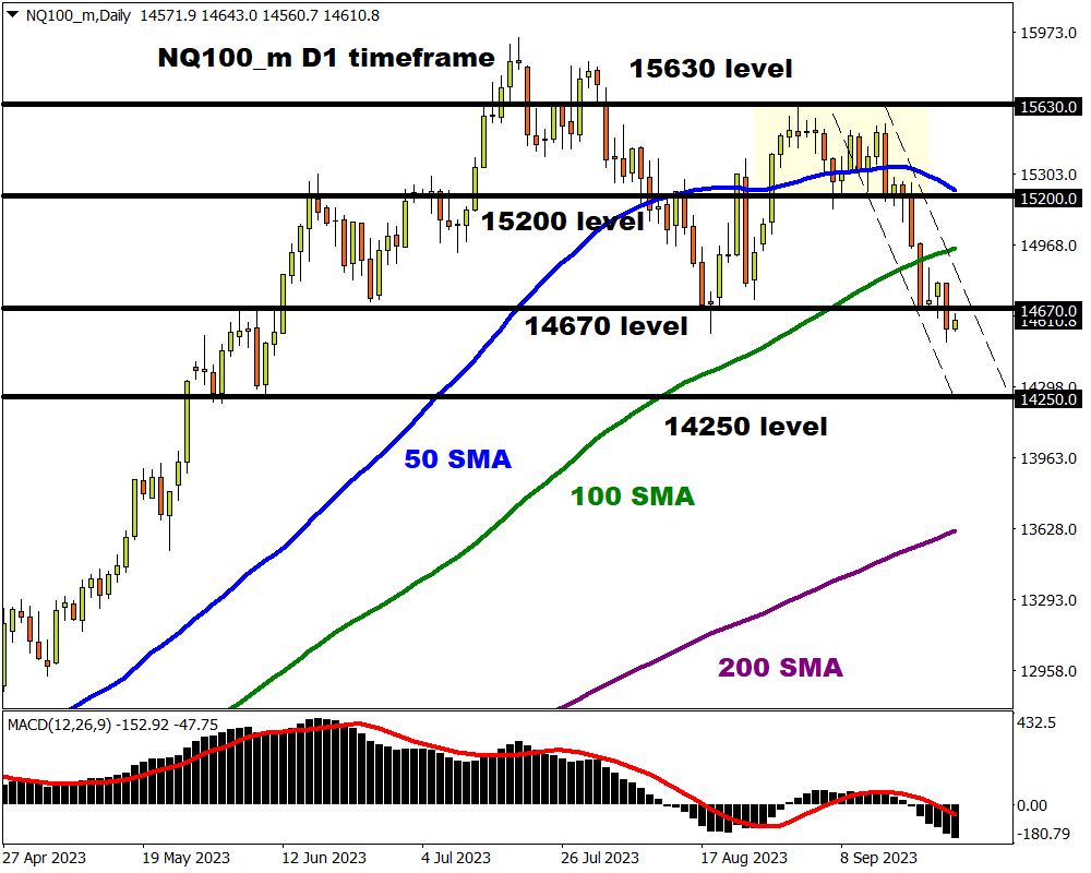 The recent breakdown below the 14670 support level may signal further downside for the NQ100_m with 14250 acting as a key level of interest.