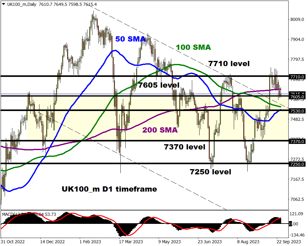 Resistance can be found at 7710 and support at 7250. Despite the choppiness, prices could be gearing up to decline given the recent break below the 200-day SMA. A strong daily close under 7605 may spark a selloff towards 7530 – where the 50-day SMA resides. If bulls can fight back, a bounce towards 7710 could be on the cards.