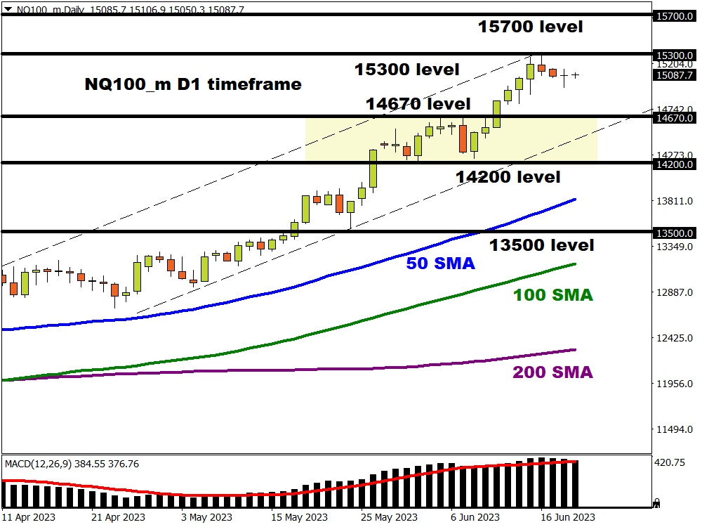 The NQ100_m remains in an uptrend on the daily charts. There have been consistently higher highs and higher lows while prices are trading above the 200-, 100- and 50-day SMA. The price action over the past few days suggests that the index could be waiting for a fresh fundamental spark before embarking on its next move. A solid breakout above 15300 could trigger an incline towards levels not seen since January 2022 around 15700. Should prices remain trapped below 15300, this may see the index sink towards 14670.
