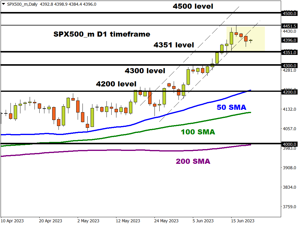 It has been a rough week for the SPX500_m thanks to the risk-off mood and overall caution. Bears seem to be on the prowl with prices slowly approaching the 4351 level. Although the trend still remains bullish on the daily charts, this outlook could be threatened if a solid breakdown and daily close below 4351 is achieved. Such a development could signal a further decline towards 4300. If prices are able to push beyond last week's high of 4451.5, the next key level can be found at 4500.