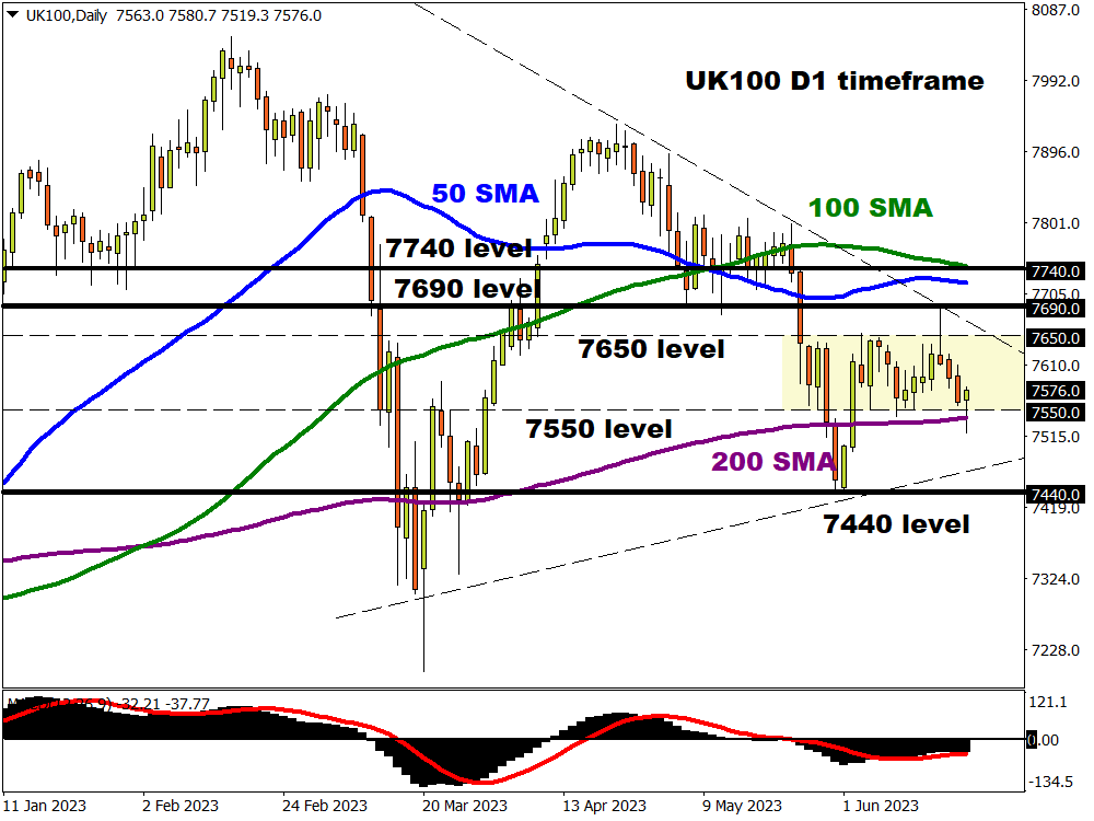 The UK100 could be gearing up for a major breakout as prices bounce with a tightening range on the daily charts. Support can be found just above the 200-day SMA at 7550 and resistance around 7650. Should prices break above 7650, this could encourage an incline towards 7690 and 7740, where the 100-day SMA can be found. A breakdown below 7550 could see prices sink towards 7440.