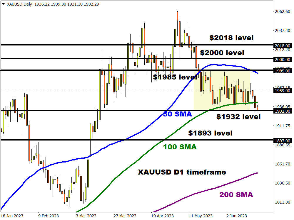 Gold prices remain under pressure ahead of Jerome Powell’s two-day hearings before Congress which kicks off today. Despite trading within a range on the daily timeframe, the scales of power seem to be swinging in favour of gold bears. A breakdown below $1932 could open a path toward $1893. Alternatively, a rebound back above $1959 may see prices retest the $1985 resistance. Should prices break above $1985, the next key level of interest can be found at $2000.