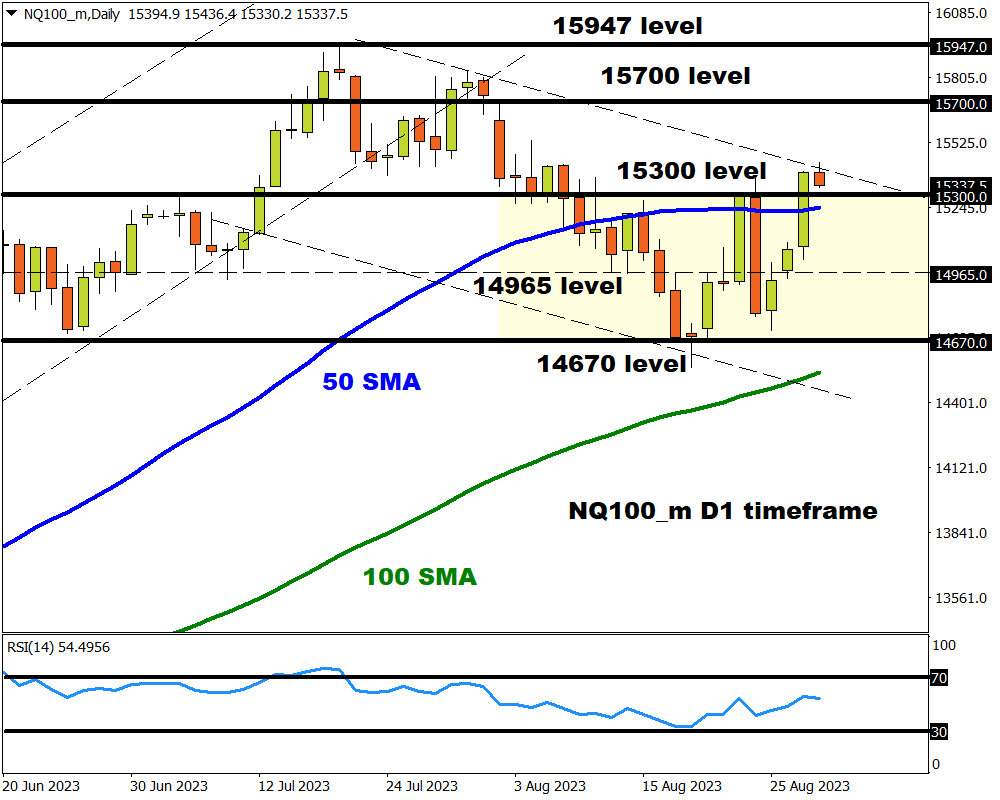 After breaking above the 15300 level, the Nasdaq 100 has the potential to push higher with the next key level of interest found at 15700. Should bulls run out of steam, prices may sink back below 15300 which could encourage a decline back towards 14965 and 14670, respectively.