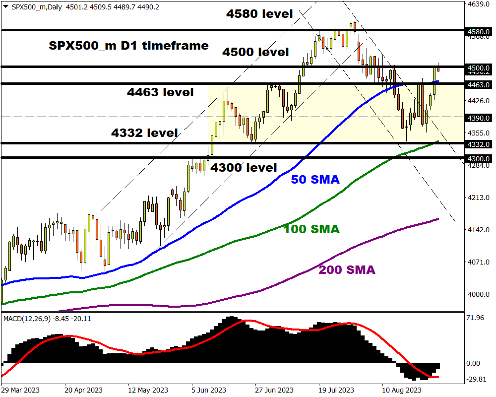 The S&P 500 experienced a solid breakout above the 50-day SMA in the previous trading session with bulls slamming into the 4500-resistance level. A solid breakout above this point could encourage an incline towards 4580. Should 4500 prove to be reliable resistance, a decline back towards 4463 and 4390 could be on the cards.