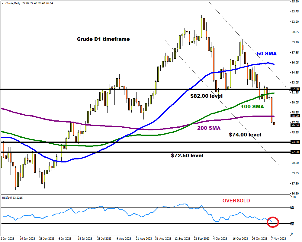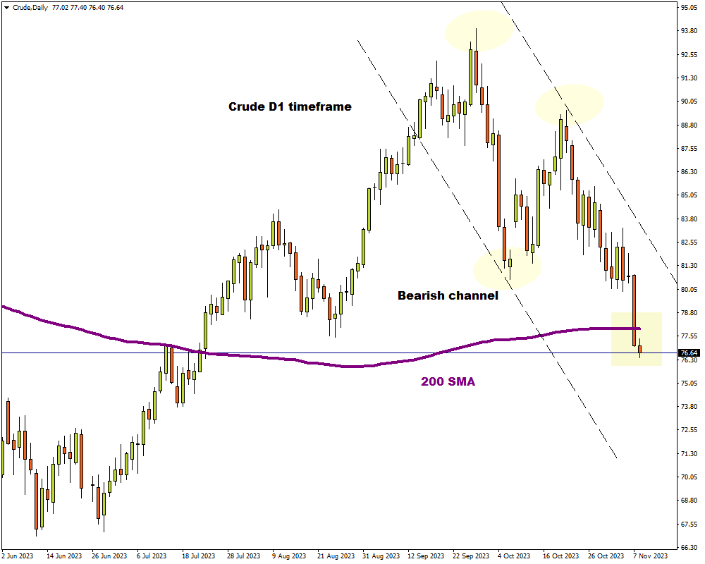 It is worth noting that technical indicators were already in favour of bears before yesterday’s steep selloff. Oil was already respecting a negative channel on the daily charts, creating lower lows and lower highs. The daily close below the 200-day SMA may open doors to lower price levels in the short to medium term.